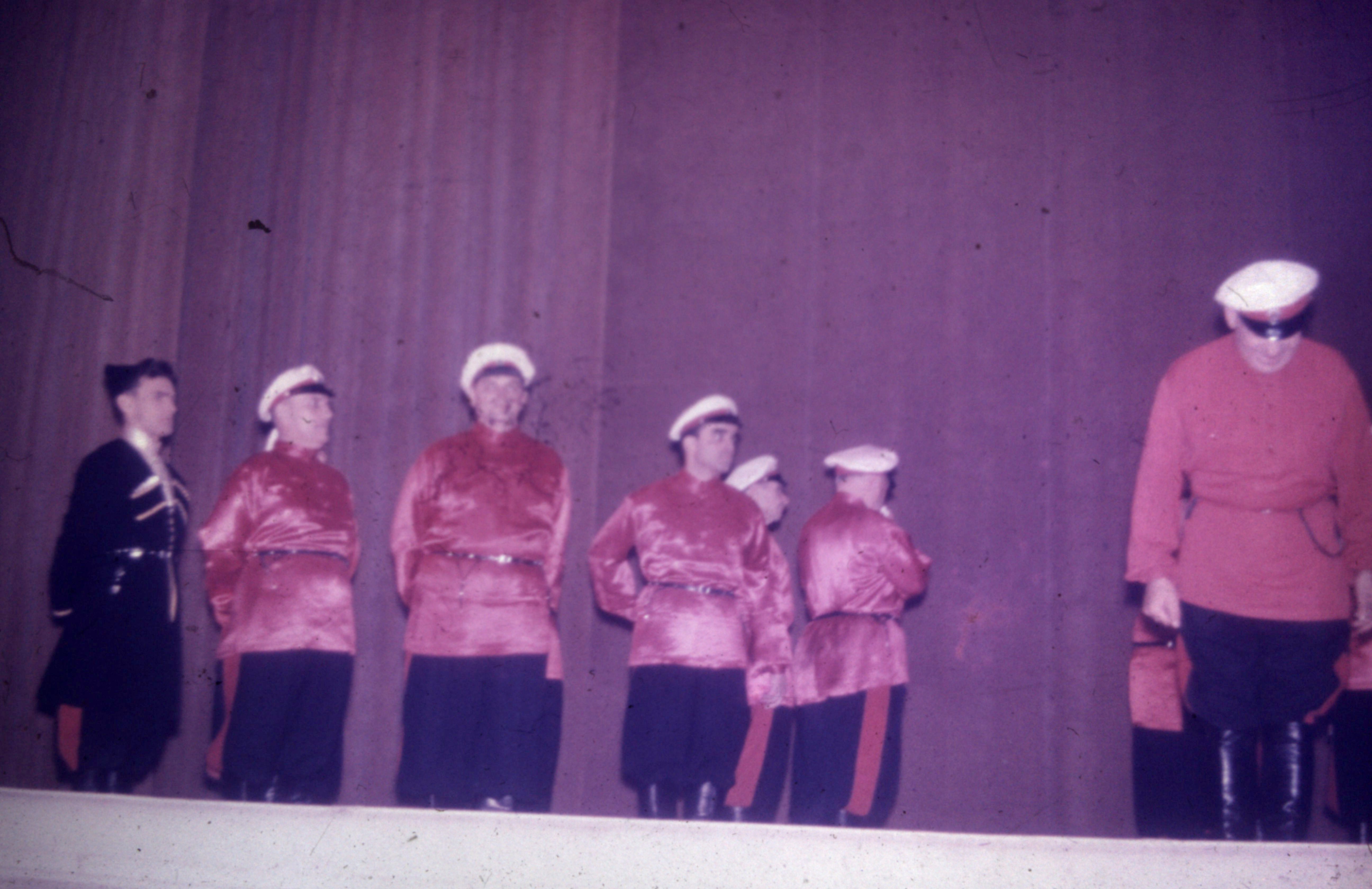 N.F. Kostruckoff taking a bow. Far left dancer: E._. Nikiforov in tcherkeska