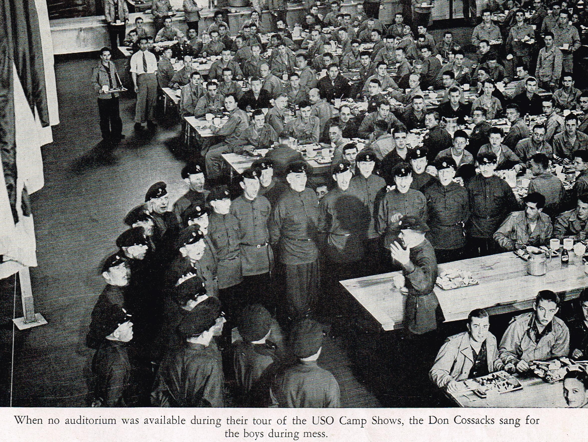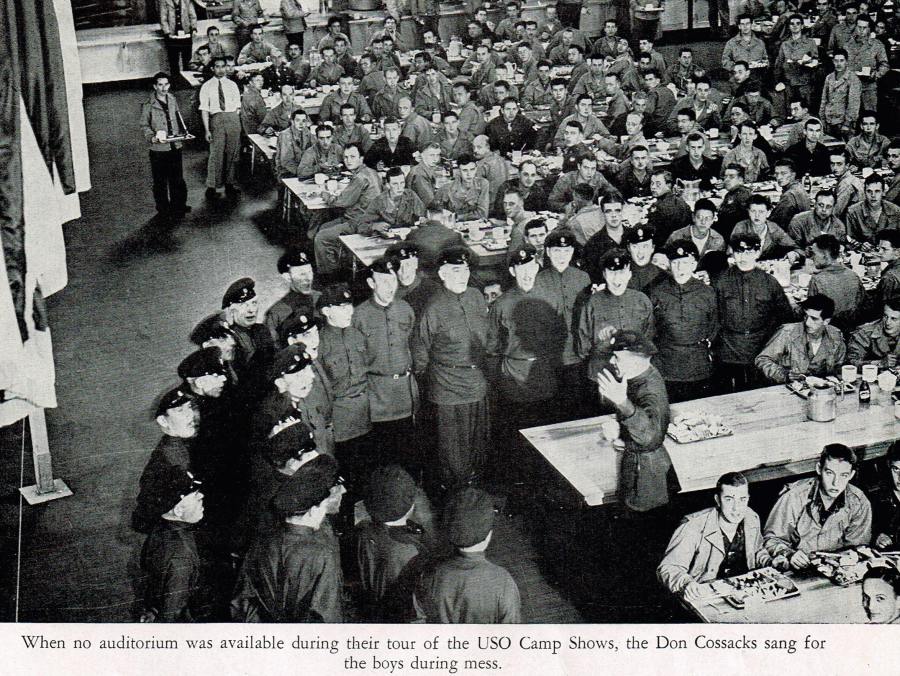 “When no auditorium was available during their tour of the USO Camp Shows, the Don Cossacks sang for the boys during mess.”