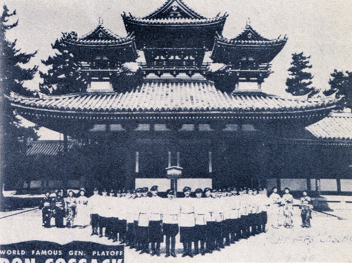 The Platoff Cossacks make a pilgrimage to the Heian-Zingu Shrine which escaped the devastating bombing of Kyoto by the B-29s.